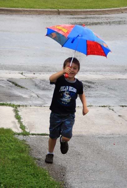 Yesterday we had a huge storm. It started out as just rain and I had to run out under JJ's little umbrella to try and get the patio cushions out of the downpour before they got too wet. JJ thought it looked like fun (it was so not fun, it was COLD!) So as soon as I yell "the rain just turned to hail" he grabs his spider man umbrella and out the door he goes. Yep that my son running around in the hail screaming like a loonatic.